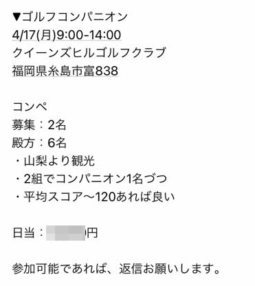 ※ゴルフ後に懇親会がある場合は、お仕事情報に載ります。